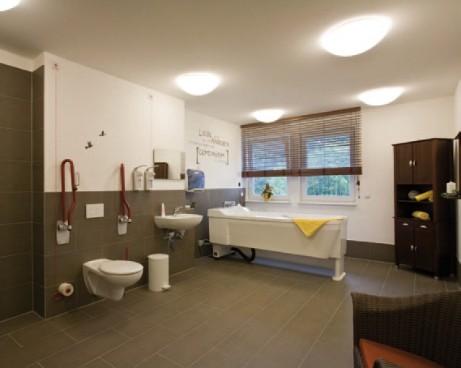 Alle Bewohnerzimmer verfügen über ein eigenes Badezimmer mit Dusche, WC und je Bewohner einem Waschtisch. Jeder Wohngruppe ist ein Gemeinschaftsraum mit Wohnküche zugeordnet. Die Gemeinschaftsräume verfügen jeweils über einen Balkon im Wintergarten und eine Loggia zur Hofseite. Je Etage sind ein Dienstzimmer und diverseLager- und Abstellräume vorgesehen sowie ein Pflegebad, ausgestattet mit Waschtisch, WC und Pflegewanne.